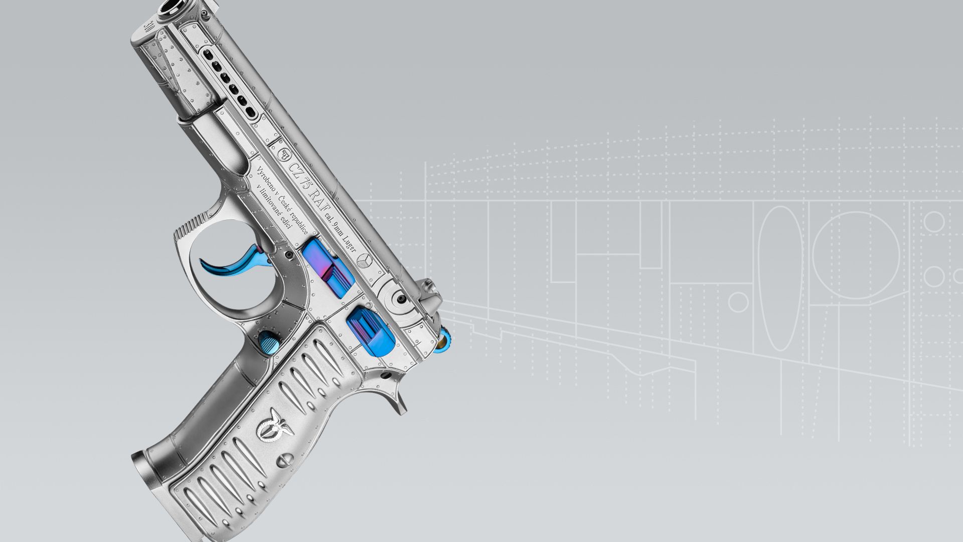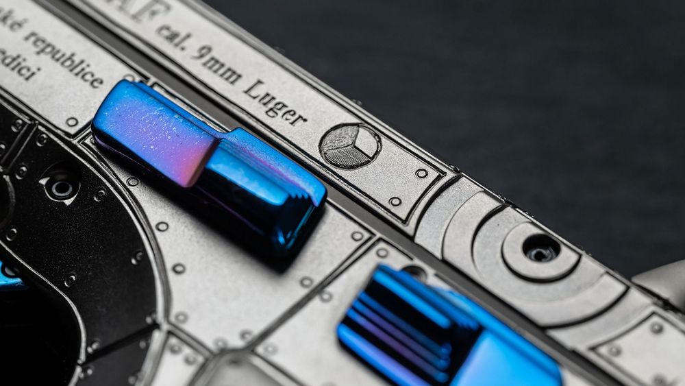 If your attention has been drawn to the pistol’s grips, you will see they are inspired by the "humps" found on the wings of the Spitfire. In the middle of the left grip, the humps are complemented by a Czechoslovak aviation badge.
