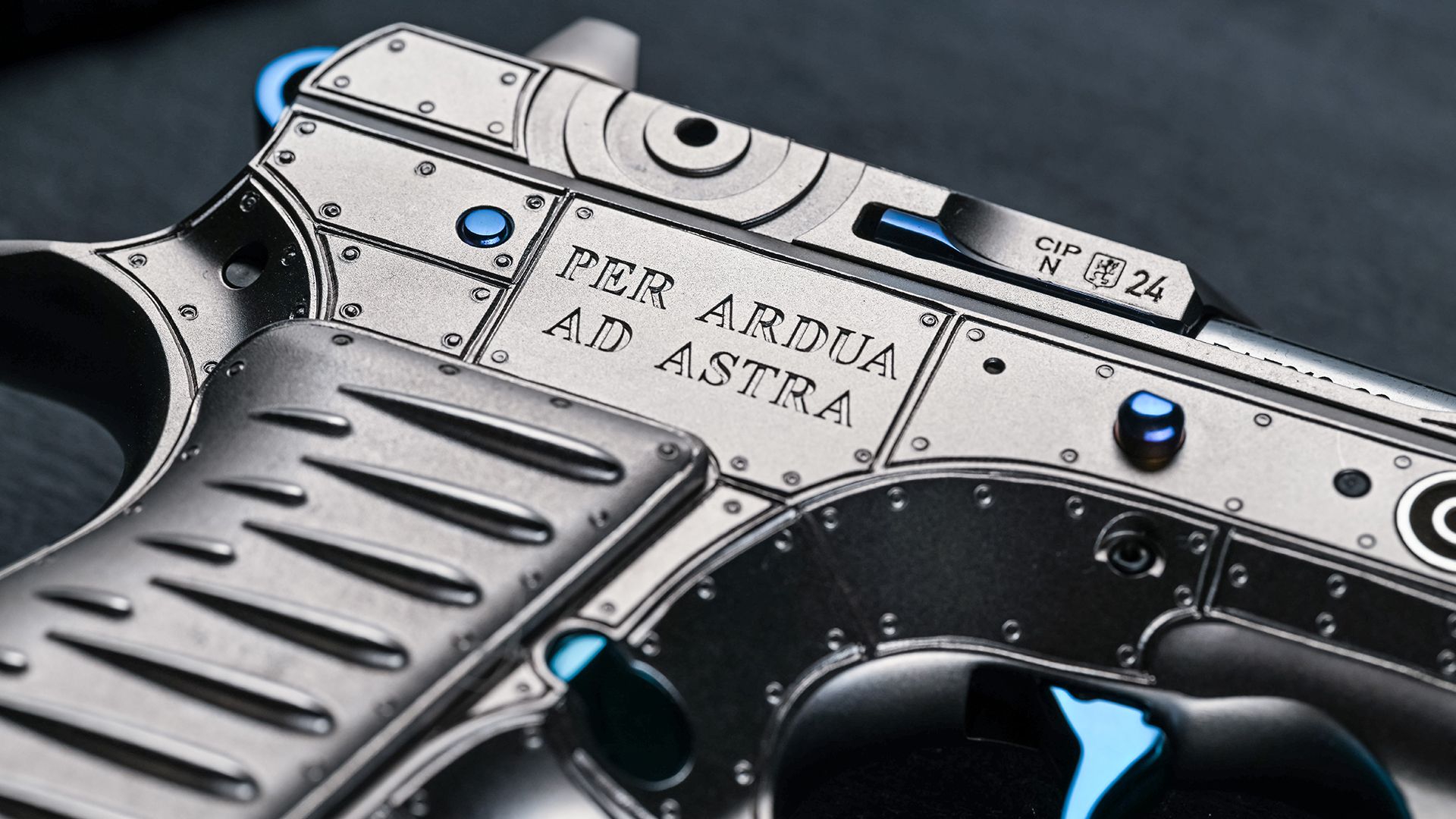 Under this decoration, you will find a key to the aluminum case that holds the pistol. Its shape is inspired by the unmistakable silhouette of the wings of a Supermarine Spitfire fighter plane.